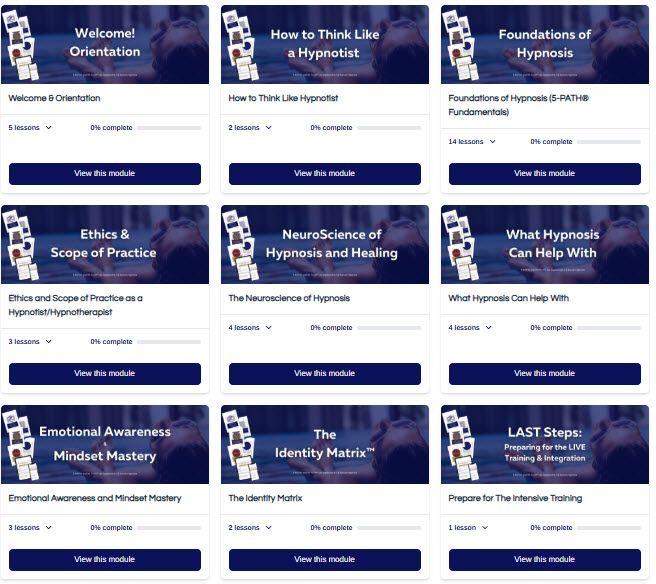 A: The self-study portion requires approximately 50 hours. The amount of time you'll need depends on when you enroll relative to your desired cohort. Once we begin the 7-day live intensive, you'll be fully immersed—expect to eat, sleep, and breathe hypnosis for one powerful week. This structure ensures you’re ready, confident, and skilled by graduation.